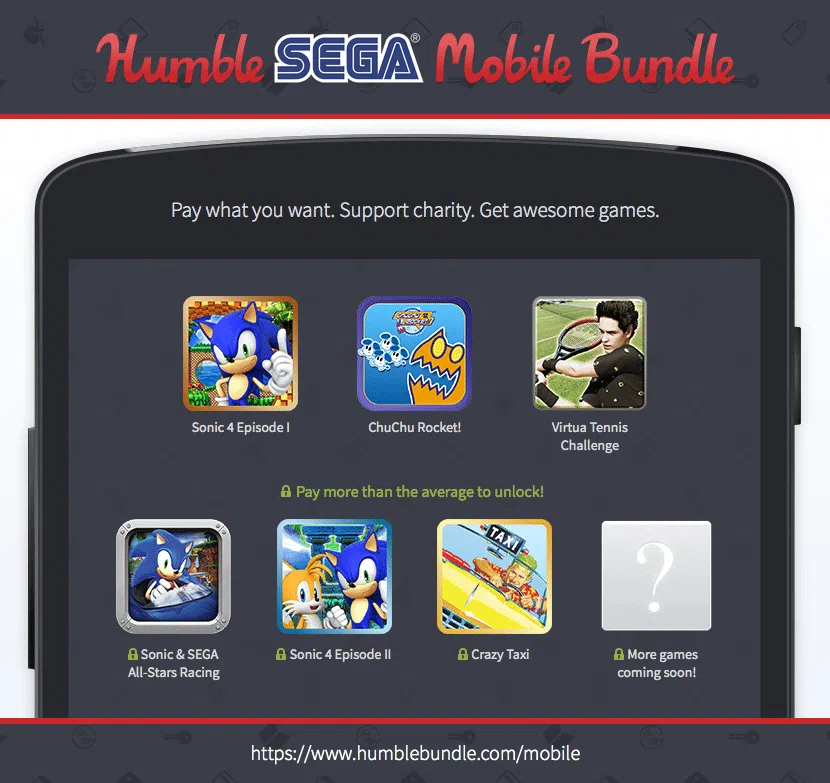 ב-Humble Bundle הזה אתם משלמים מה שאתם רוצים עבור שלושה משחקים: סוניק 4 פרק 1, טיל צ'וצ'ו! e Virtua Tennis Challengeלרכוש סוניק וסגה אולסטארס מרוצי סוסים, סוניק 4 פרק II e Crazy Taxi יהיה צורך לשלם סכום השווה או גדול מממוצע התשלומים שבוצעו, נכון לעכשיו, סכום זה הוא 3,75 דולר.